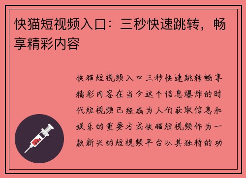 快猫短视频入口:三秒快速跳转,畅享精彩内容